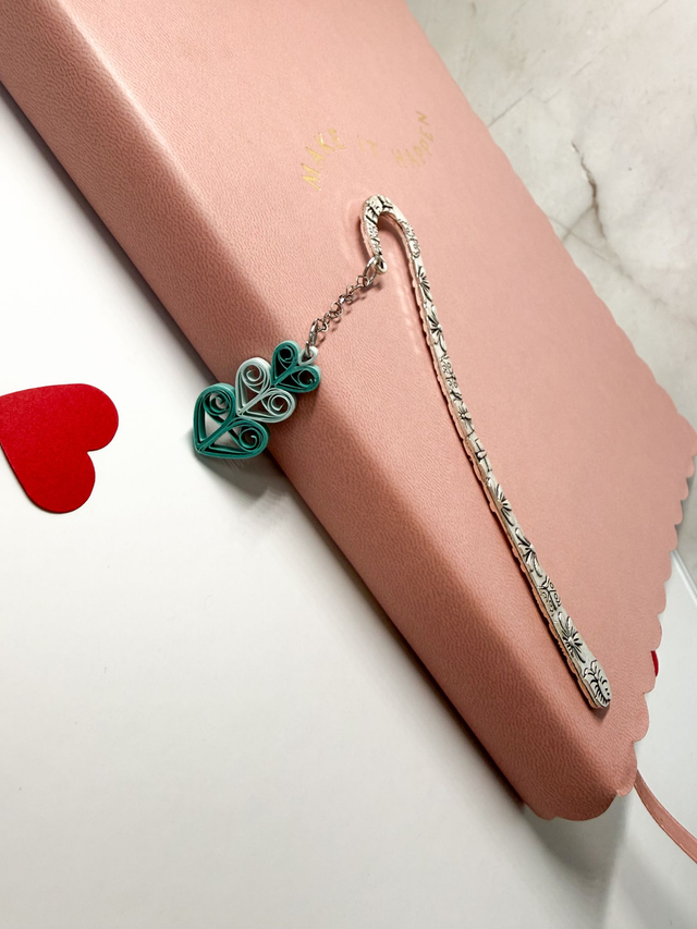 Marque-page artisanal composé de trois cœurs superposés. Léger et pratique, il apporte une touche délicate et originale à vos lectures.